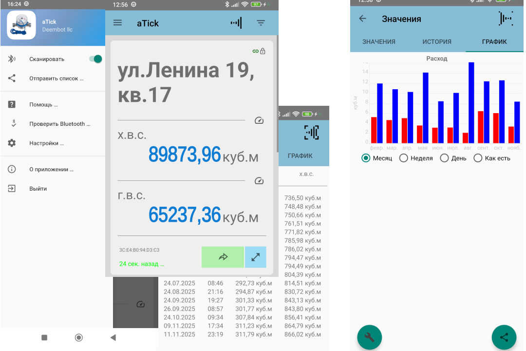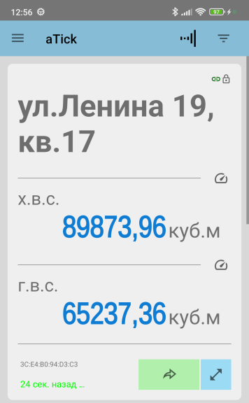 Достаточно приблизится к месту размещения счетчиков со своим смартфоном и мобильное приложение aTick считает текущие показания и запомнит их. Позже, в любой удобный момент, даже находясь в далеко от счетчиков, вы можете открыть приложение и посмотреть сохраненные значения и дату их актуальности.
